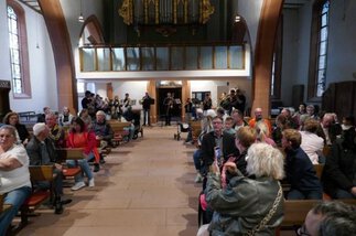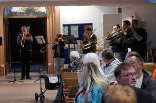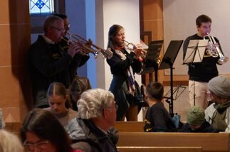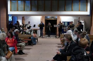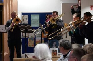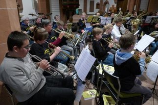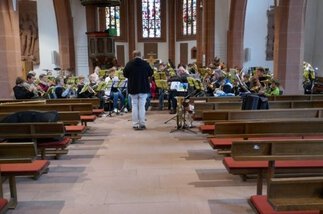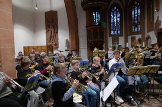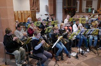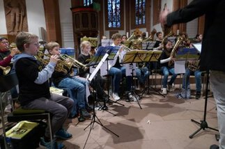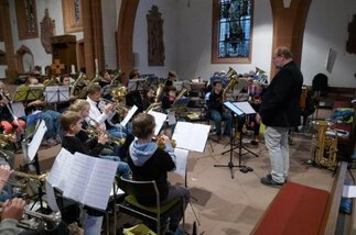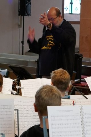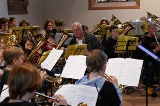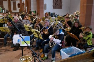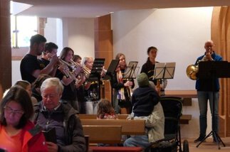- Die Jungbläserinnen und Jungbläser zusammen mit Ihren Ausbildern bildeten die größte Gruppe in der ev. Kirche Groß -Umstadt. Geleitet von Klaus Jörg Borger und teilweise am Schlagzeug unterstützt von Helmut Jung erlernten sie mehrere Stücke für das Abschlußkonzert. Klaus Jörg hatte interessante Stücke herausgesucht und diese mit viel Geduld und Spaß mit allen eingeübt. Sein Plan "wir schauen mal was geht und wenn etwas nicht klappt, werfen wir es aus dem Programm für das Abschlußkonzert" durchkreuzten seine Bläserinnen und Bläser. Sie waren so gut, dass alles aufgeführt wurden.